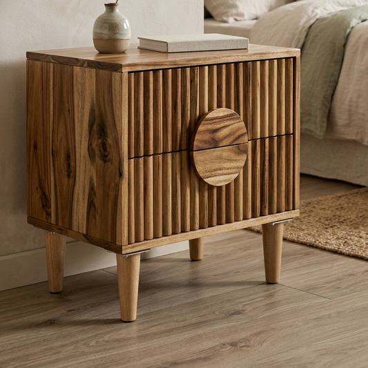 ADOUER WOOD Fluted Bedside Table – 2-Drawer Nightstand with Circular Moon Handle