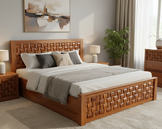 ADOUER WOOD Premium Sheesham Wood Bed with Woven Checkerboard Design and Box Storage