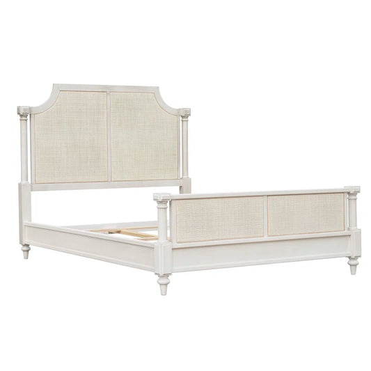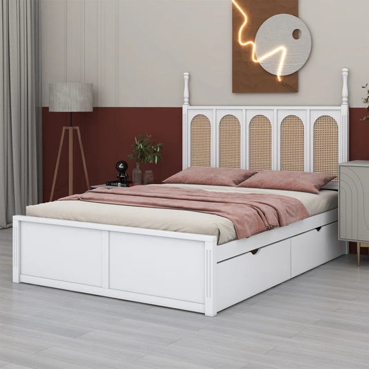ADOUER WOOD Solid Acacia Wood Vintage Luxury White Classic Rattan Cane Bed, Without Storage