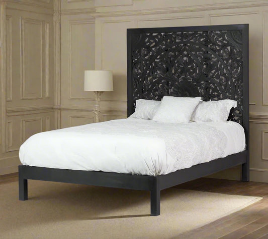 ADOUER WOOD Solid Sheesham Wood Luxuries Hand Carving Long Headboard Bed, Without Storage