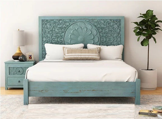 ADOUER WOOD Solid Sheesham Wood Luxuries Antique Blue Distressed Hand Carving Bed, Without Storage
