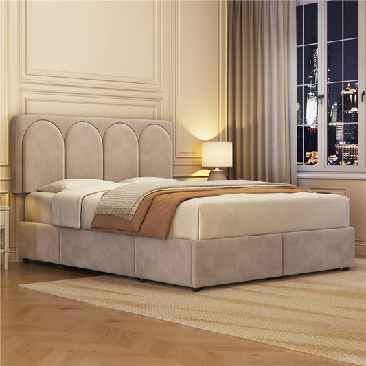 ADOUER WOOD Upholstered Handmade Tufted Tall Bed Frame with Velvet Headboard, Tall Wing-Back, Without Storage