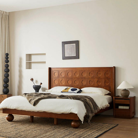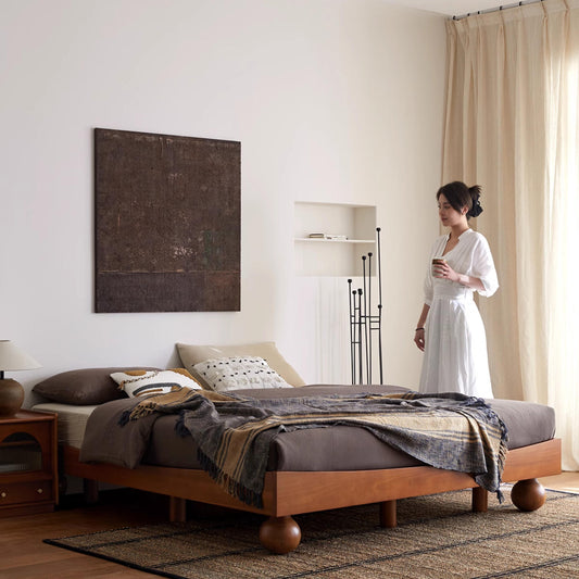 Japanese Style Low Platform Bed: Honey Acacia Wood with Distinct Spherical Legs