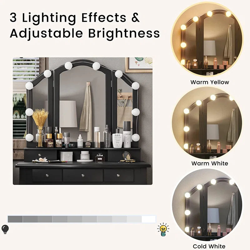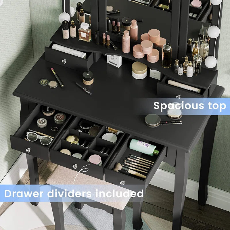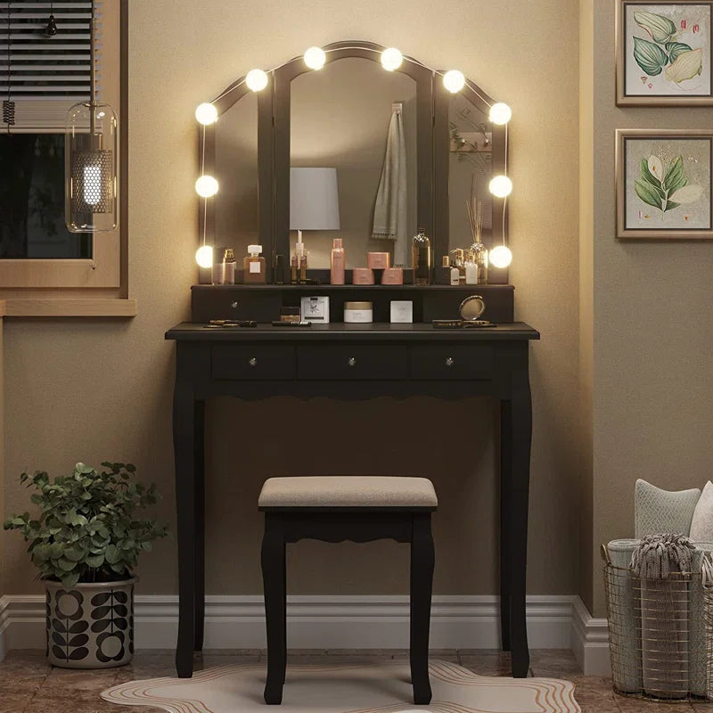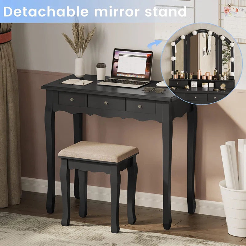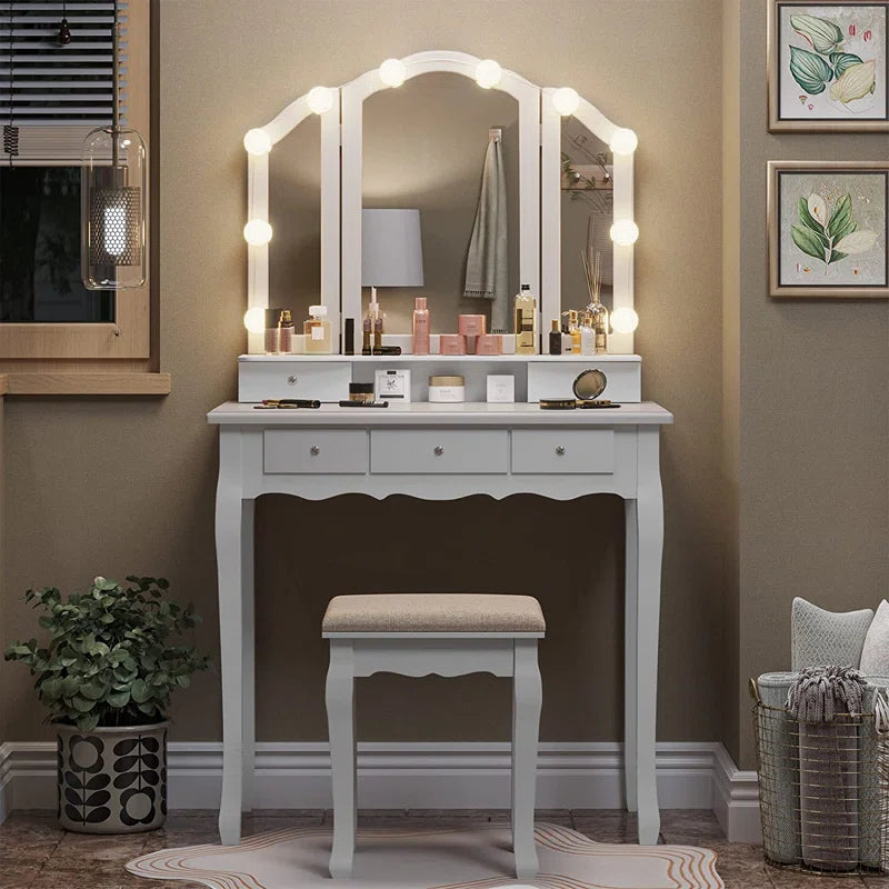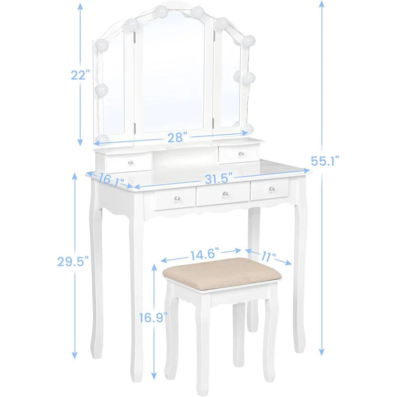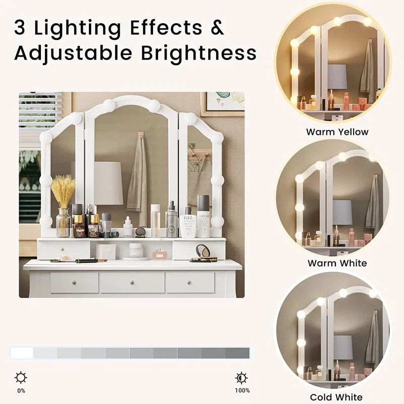 ADOUER WOOD "Elegant White Vanity Dressing Table with Tri-Fold Mirror and Cushioned Stool"