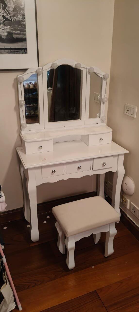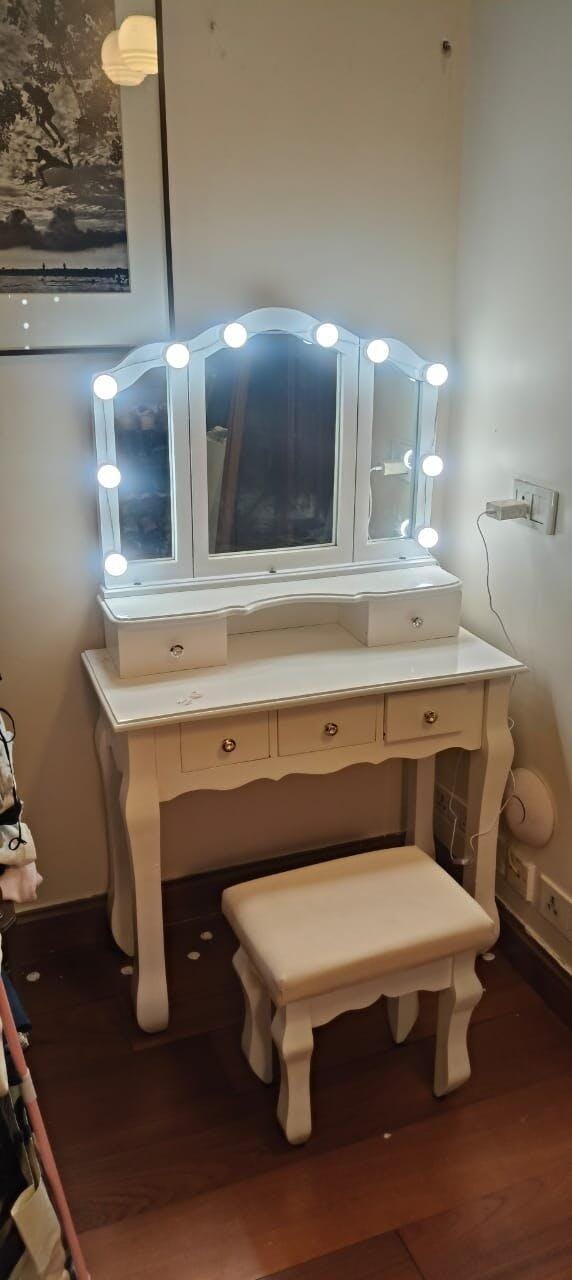 Absolutely love this dressing table with lights! The built-in lighting is perfectly bright and evenly placed, making daily grooming and makeup so easy. The design looks premium, the finish is smooth, and the storage space is very useful for keeping everything organized. It adds a classy touch to the room and feels sturdy and well-crafted. Truly a perfect blend of beauty and functionality. Highly recommended