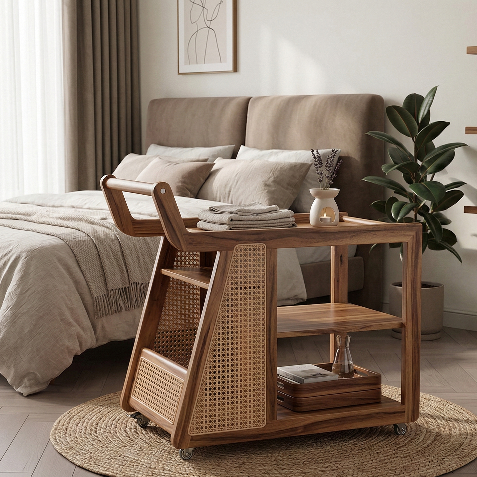 ADOUER WOOD Rolling Bar Cart with Natural Rattan Inlay – 3-Tier Mobile Coffee Station & Kitchen Serving Trolley