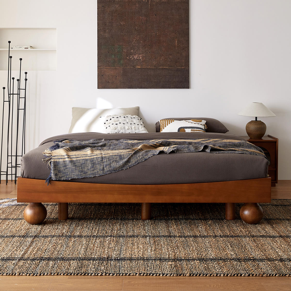 Japanese Style Low Platform Bed: Honey Acacia Wood with Distinct Spherical Legs
