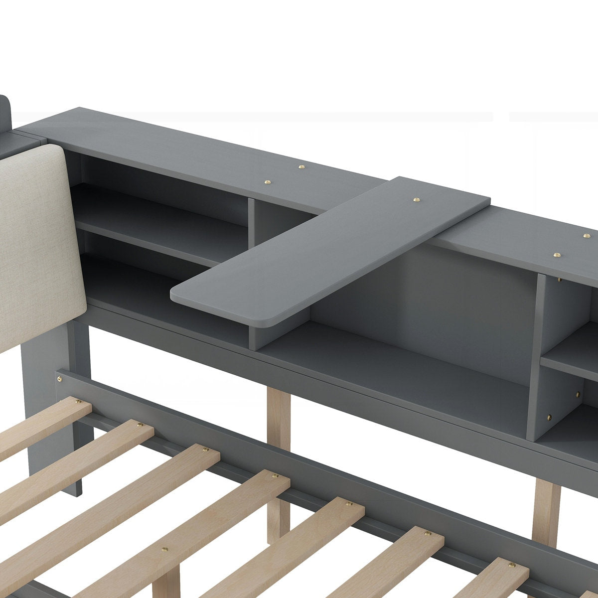 Modern Solid Wood Trundle Bed with Built-In Bookshelf Headboard & Pull-Out Storage Bed