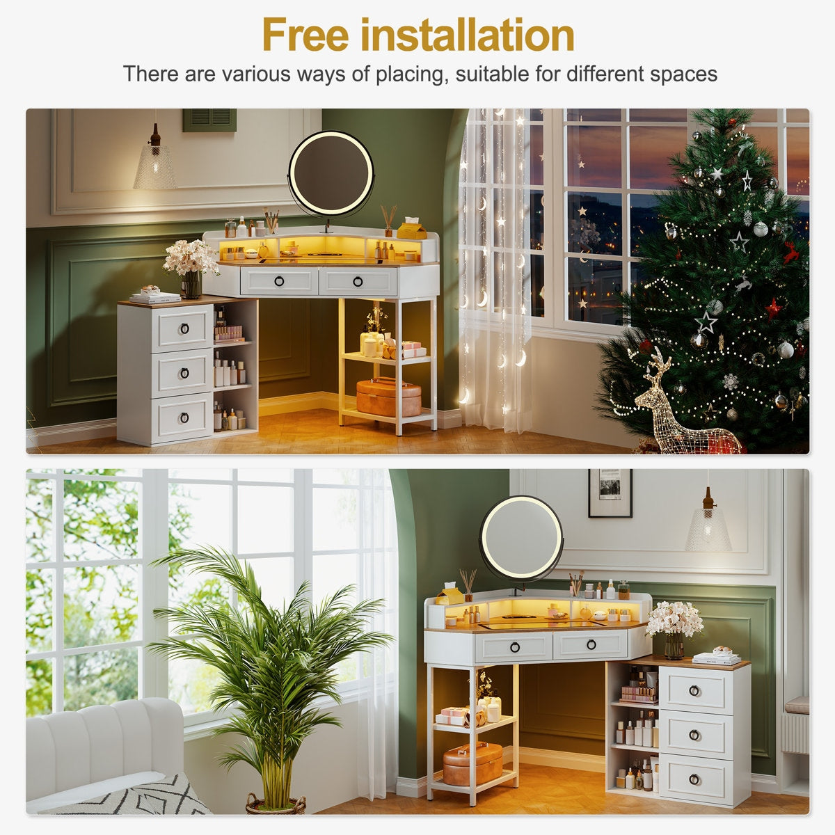 Premium Solid Wood Corner Vanity Station: Includes Lighted Mirror, Glass Top Display & Side Chest